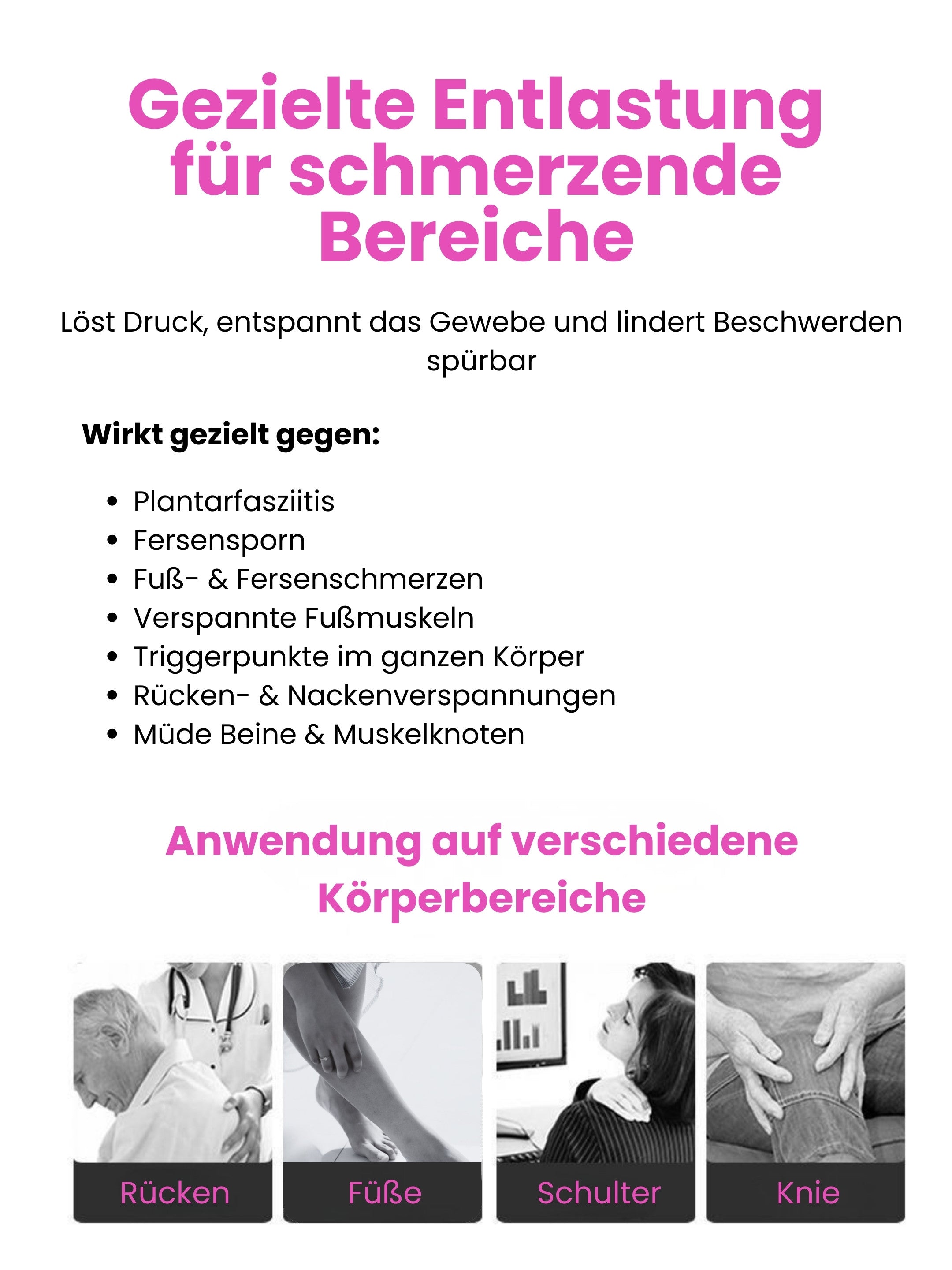 Durch punktgenauen Druck löst er verklebte Faszien, aktiviert die Durchblutung und lindert Fersen- und Fußschmerzen.