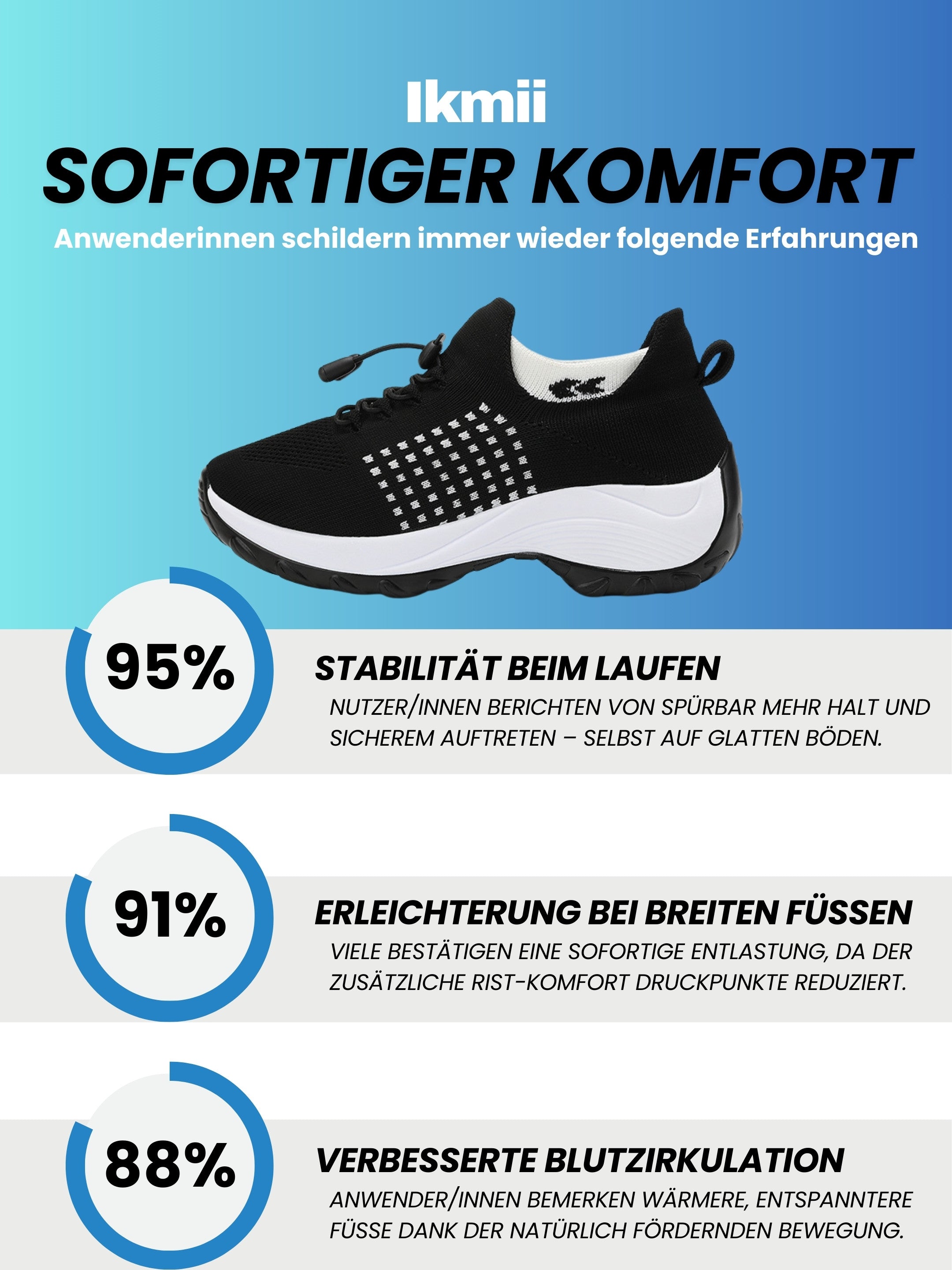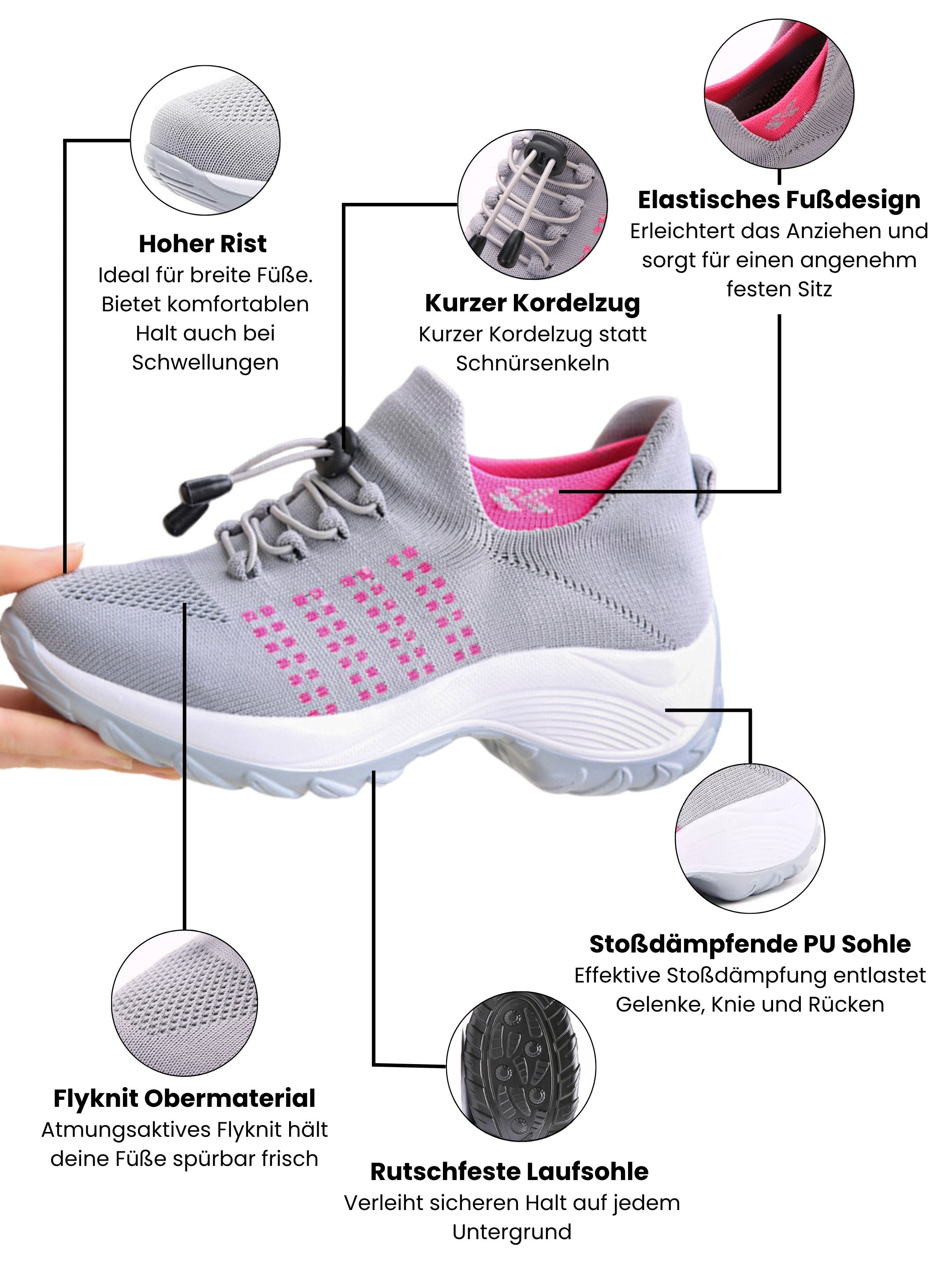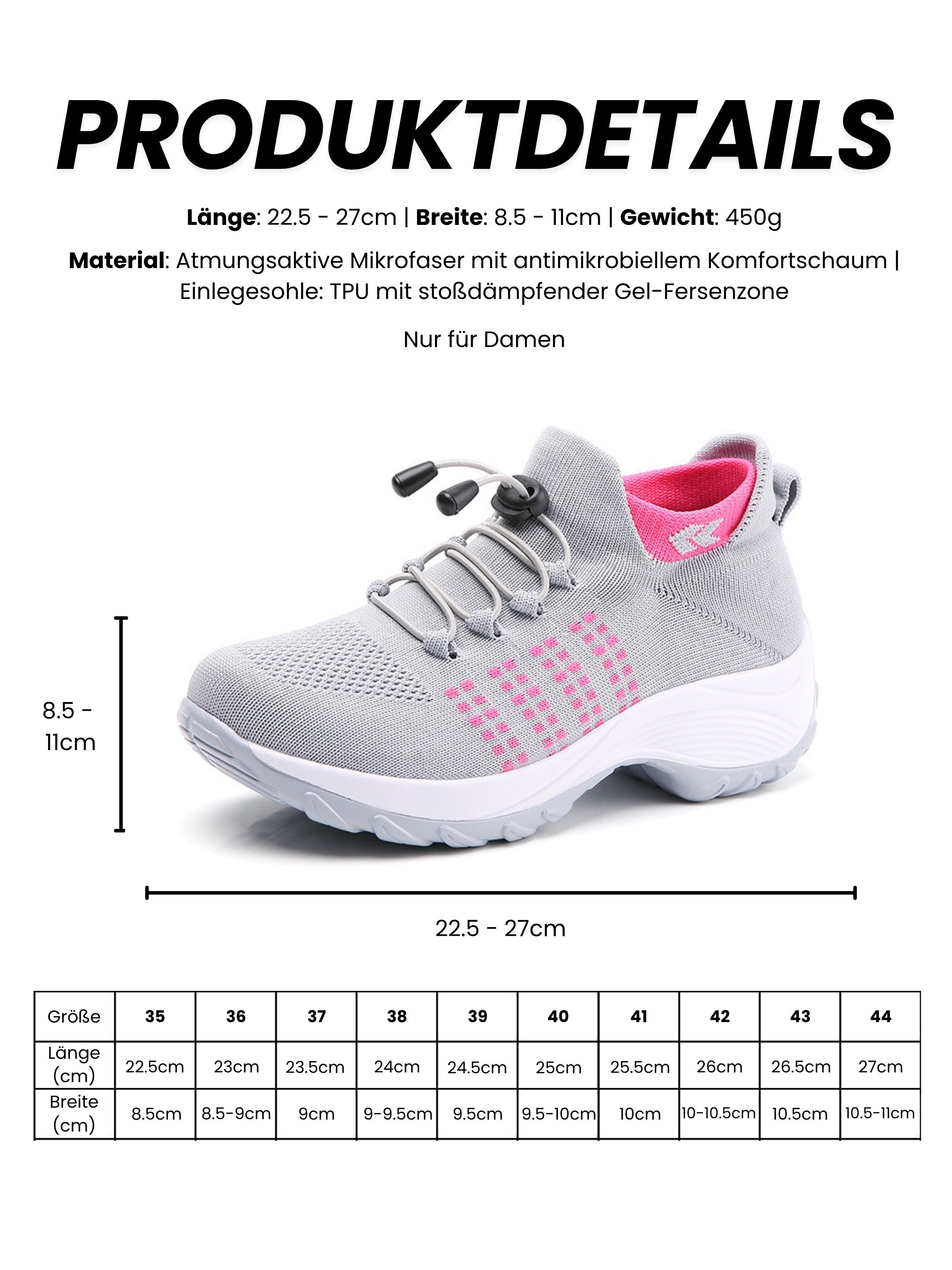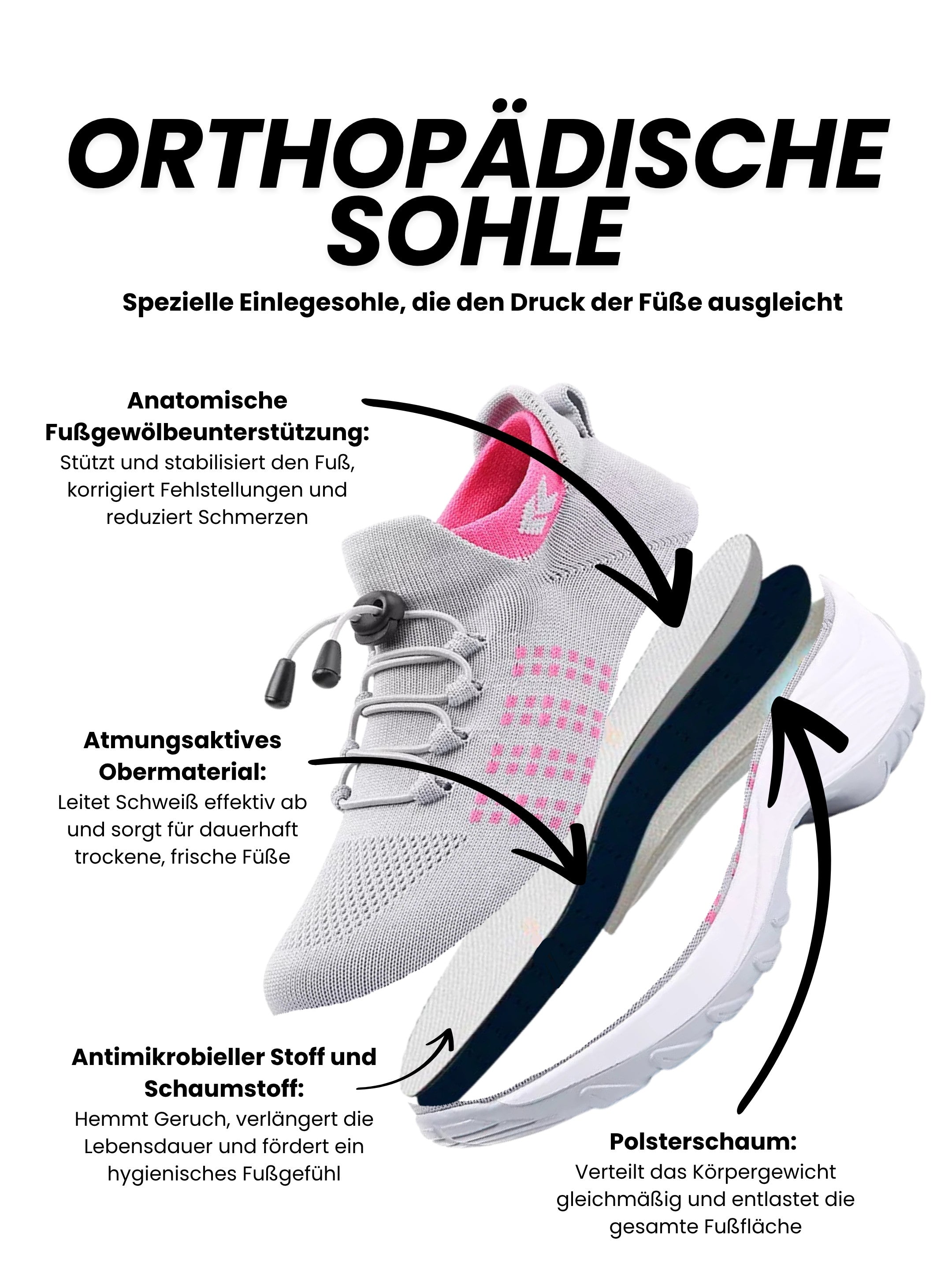 Die Kombination aus orthopädischer Sohle, ergonomischem Fußbett, stoßdämpfender Dämpfung und breiter Zehenbox sorgt für eine natürliche Fußhaltung, weniger Druckstellen und dauerhaft schmerzfreies Gehen.