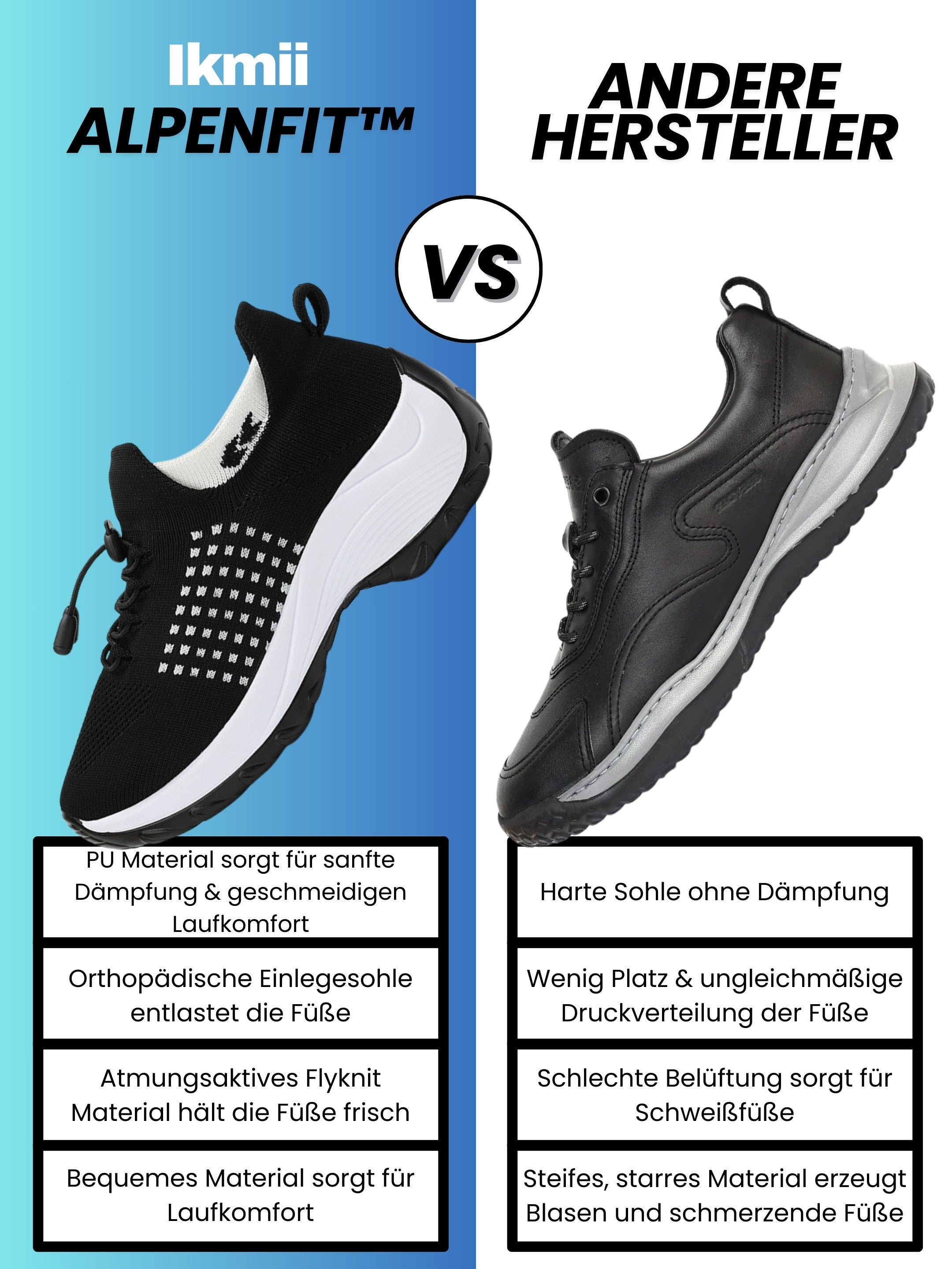 Die Alpenfit™ sind ideal für alle, die viele Stunden auf den Beinen sind oder diejenigen, die unter Fußschmerzen, Fehlstellungen (z. B. Hallux Valgus, Spreizfuß, Plattfuß), Fersenproblemen oder müden Füßen leiden. Sie bieten maximalen Komfort für Alltag, Arbeit und lange Gehstrecken.
